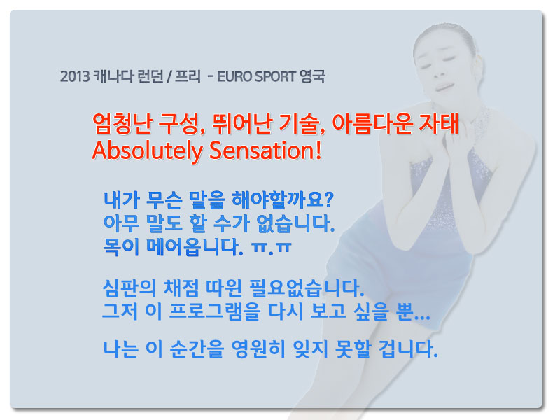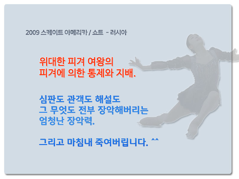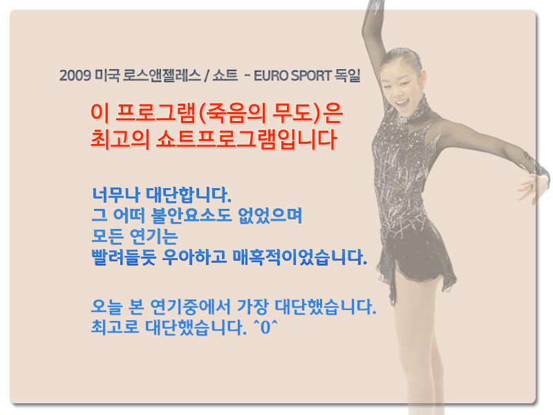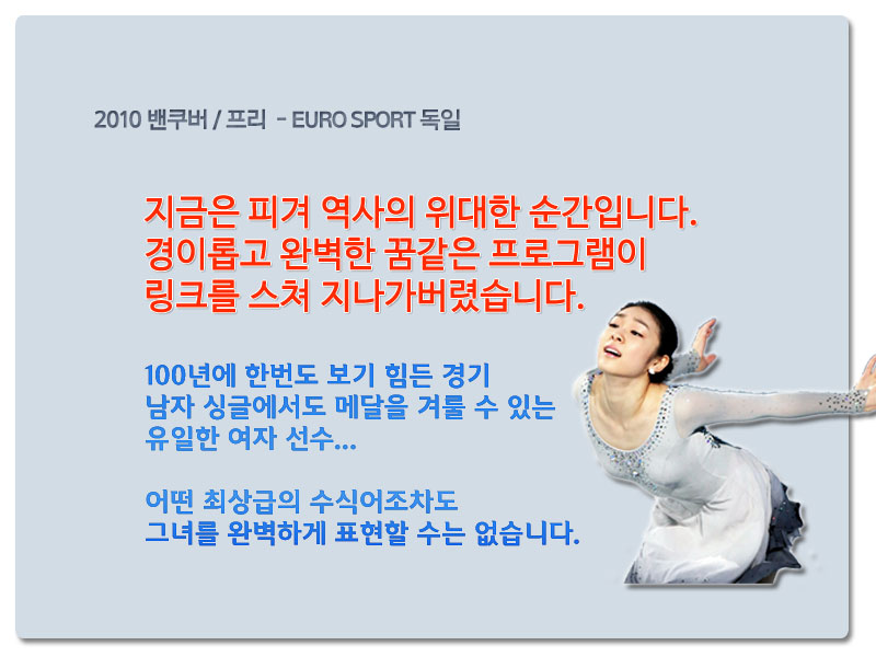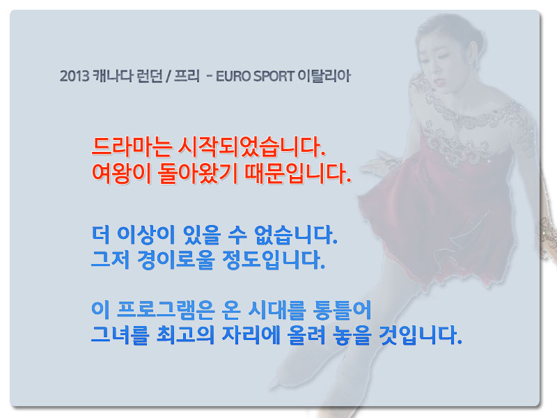 이 사이트는 연아양을 진심으로 아끼는 삼촌팬이 개인적으로 만든 순수/비영리/개인 웹사이트입니다. 연아양과 연아팬 모두에게 전하고 싶은 헌정(獻呈)의 그것이기도 하고 제 스스로 연아양의 프로그램을 언제든지 볼 수 있도록 만든 개인(個人)의 그것이기도 합니다. ^^